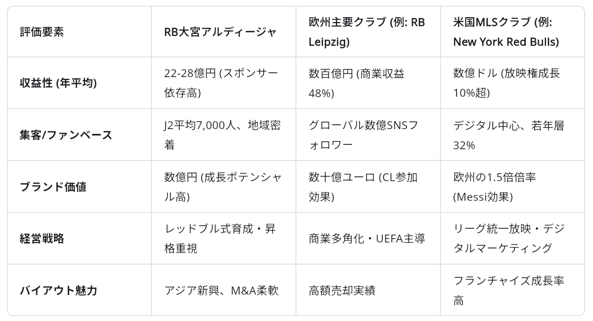 全体として、大宮アルディージャは収益・ブランドで欧州/MLSに劣るが、地域密着とレッドブル戦略で将来有望性を示す。J1昇格が相対的位置を向上させる鍵。