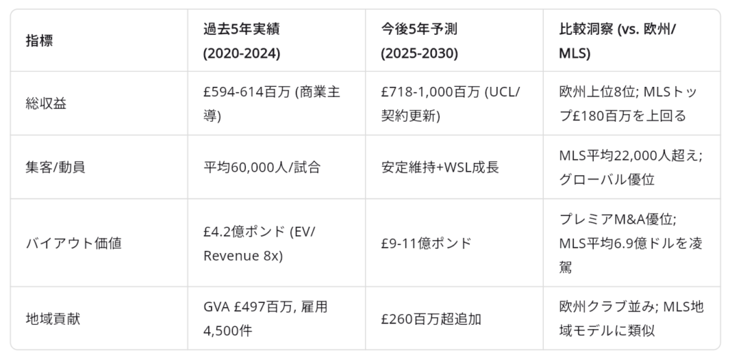 – 2025-26年: 新しいプレミアリーグTV放映権サイクル(総額£12.25bn)が開始され、放送収入をさらに増加。PayPalやCoca-Colaとのパートナーシップにより、商業収益が£308mを超過。全体収益は£650m超と予測され、PSR(Profit and Sustainability Rules)遵守下で£750mの投影も可能。