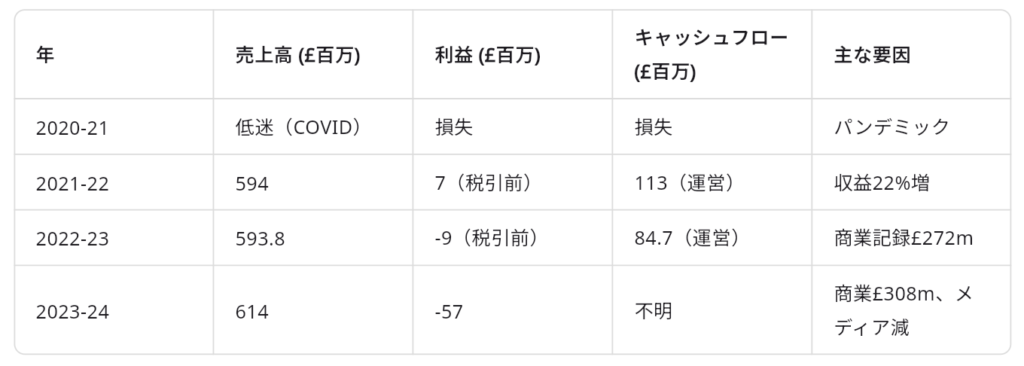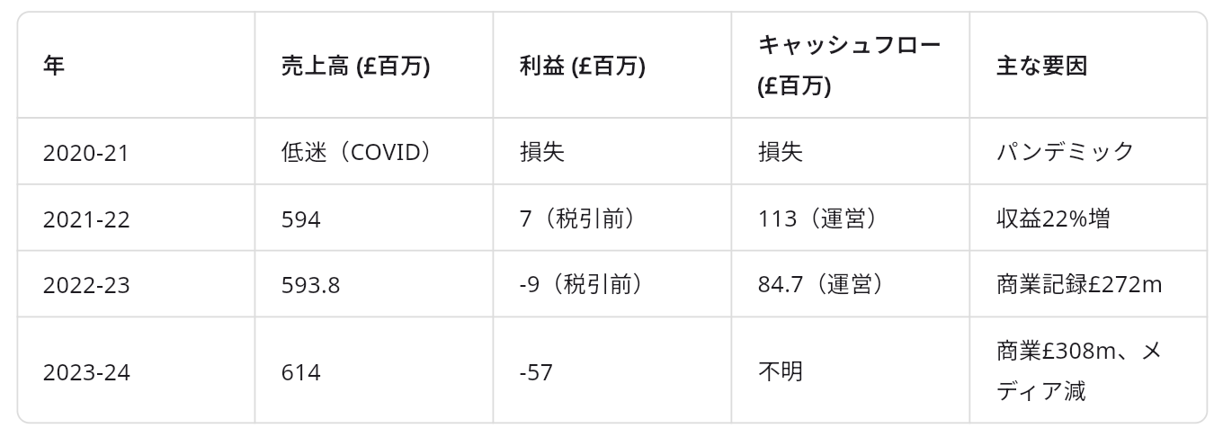 利益率は変動が大きく、2022-23年に税引前損失£9百万、2023-24年に£57百万の損失拡大。これは運用コスト増と減価償却£39.2百万によるが、調整後では健全。2021年の流動資産は33%減少し財務変動を示すが、全体として商業主導の回復基調を維持。