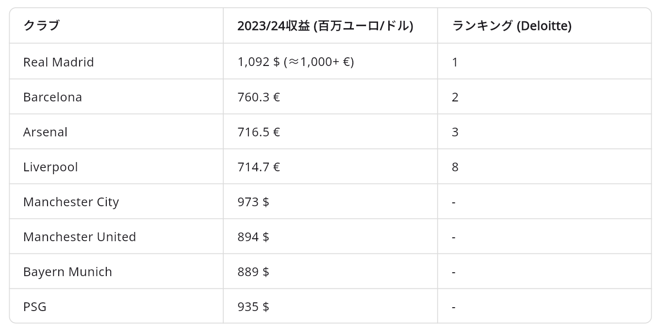 欧州主要クラブ(Real Madrid, Barcelona等)との比較では、リヴァプールの収益構造(商業44%)がブランド価値1.4億ユーロで上位を維持する一方、MLSクラブの成長性(平均評価6.9億ドル、Inter Miami13億ドル)は地域密着型で脅威だが、規模で劣る。投資判断指標として、以下に主要な財務・成長メトリクスをまとめる。