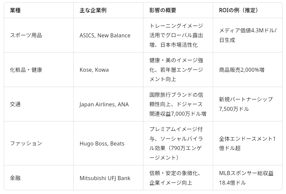スポンサー企業の業種分析では、スポーツ用品(ASICS、New Balanceなど、約30%)が最多で、大谷のトレーニングイメージを活用したマーケティングが顕著だ。次いで化粧品・健康(Kose、Kowa)、交通(Japan Airlines、All Nippon Airways)、ファッション(Hugo Boss)、金融(Mitsubishi UFJ Bank)などが続き、日本企業が60%を占める傾向にある。この多角化は、大谷の国民的アイコンとしての地位が、プレミアムブランドの信頼性向上や市場拡大を促進することを示す。2022年の新規契約増加から2024年の国際ブランド追加まで、ポートフォリオの進化が広告価値の基盤を強化した。