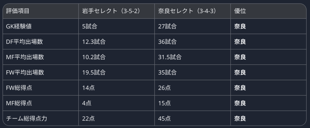 データ上では奈良セレクトチームが圧倒的に有利です。主な根拠は以下の通りです。